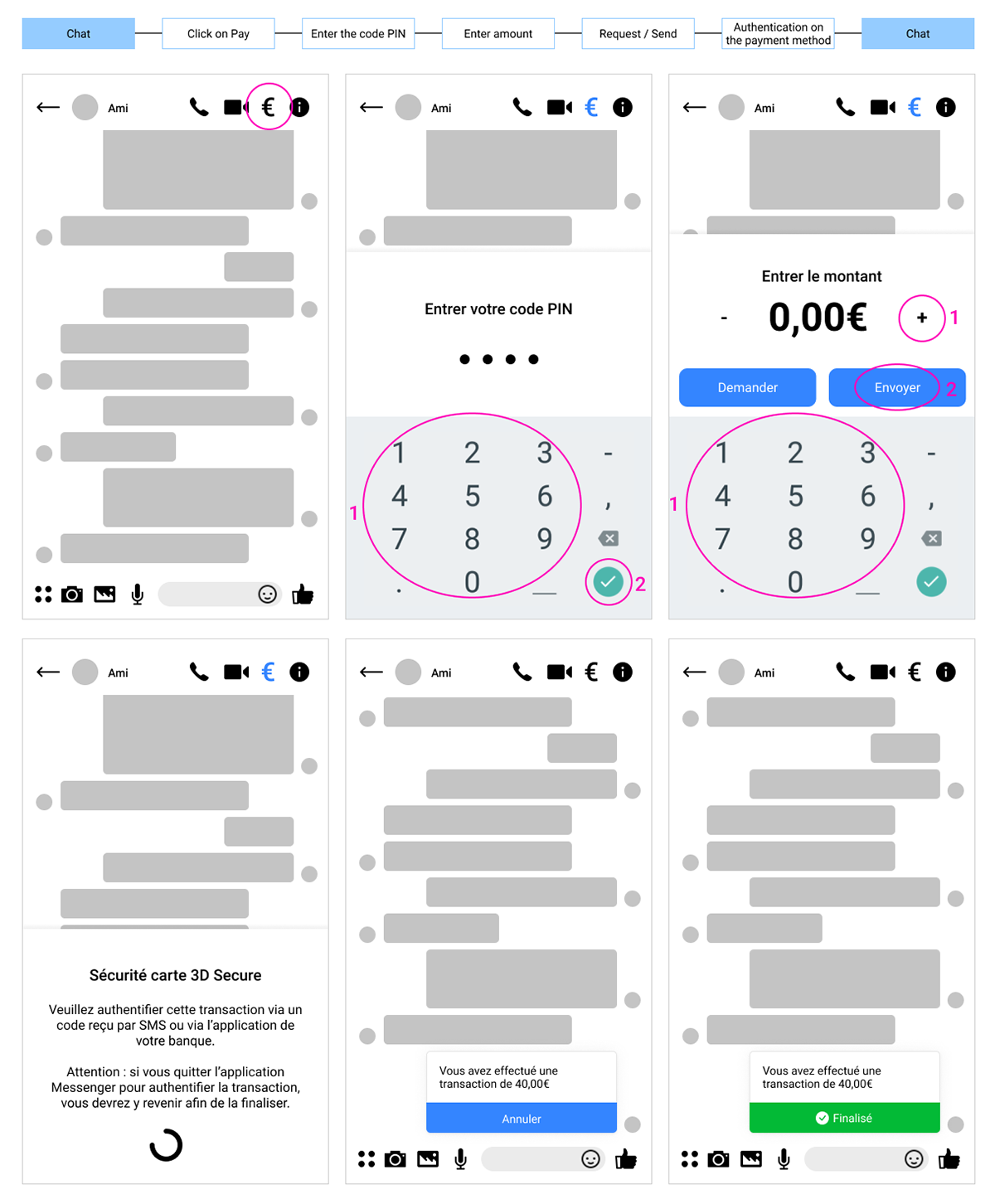 For the user path, I decided to keep the pin code and place it at the start of the process. It’s a first security check that can make people feel like you can’t transfer money by mistake and if someone is using their phone (children, partner, parent or friend) they won’t be able to make a payment. I went for a very simplified version, without a message added to the transfer, it’s just the amount and security check. Since we are directly inside the chat, the payment will already be in the situation. After entering the amount, the person requests or sends the money. The next step is the usual step that we encounter almost every time we do payment on the internet, it’s the security check through the bank or payment system. Then, the process is over, it appears inside the messaging flow.