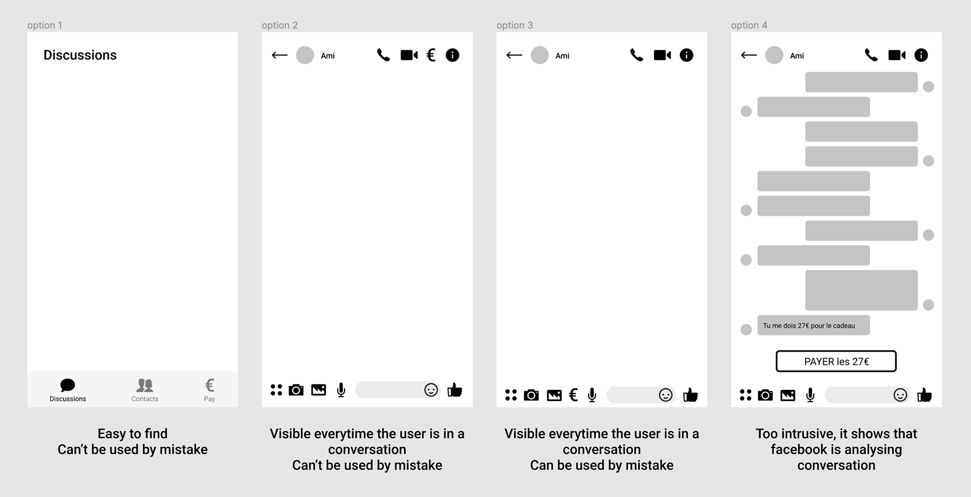 In this flow, users won’t come across the Pay functionality casually. As Humans, we have habits and rarely go out of it. When using an app we tend to always do the same things without thinking. When functionalities are hidden, users won’t naturally think of it when they need it. For example, it’s in the same place as localization sharing. As a user, if I have to share my localization, my first thought would be to go on a map app and share it that way. I won’t think of Facebook. Since it’s in the same menu as Facebook Pay, if a user needs to pay someone in the US, they will think of using Venmo or Paypal but not necessarily Facebook Pay. This means, users have to know it exists and only then they will eventually find it and use it. It’s placed with other rarely used functionalities (localization and “salon”, in the USA version there is gif as well but since I can’t test it I will assume that you can access it through the smiley like on the French version and people won’t really use it there, at least I never used those functionalities and never had a friend using it with me). If Facebook wants users to think or start having the habit of using Facebook Pay. They need to implement a hint system or a communication telling users about Facebook Pay and how it works. Or the other solution is to move it somewhere else to make it more visible at all times. On an app whose payment is not its primary function, it would increase the chances people would think of it when they need to transfer money to someone.